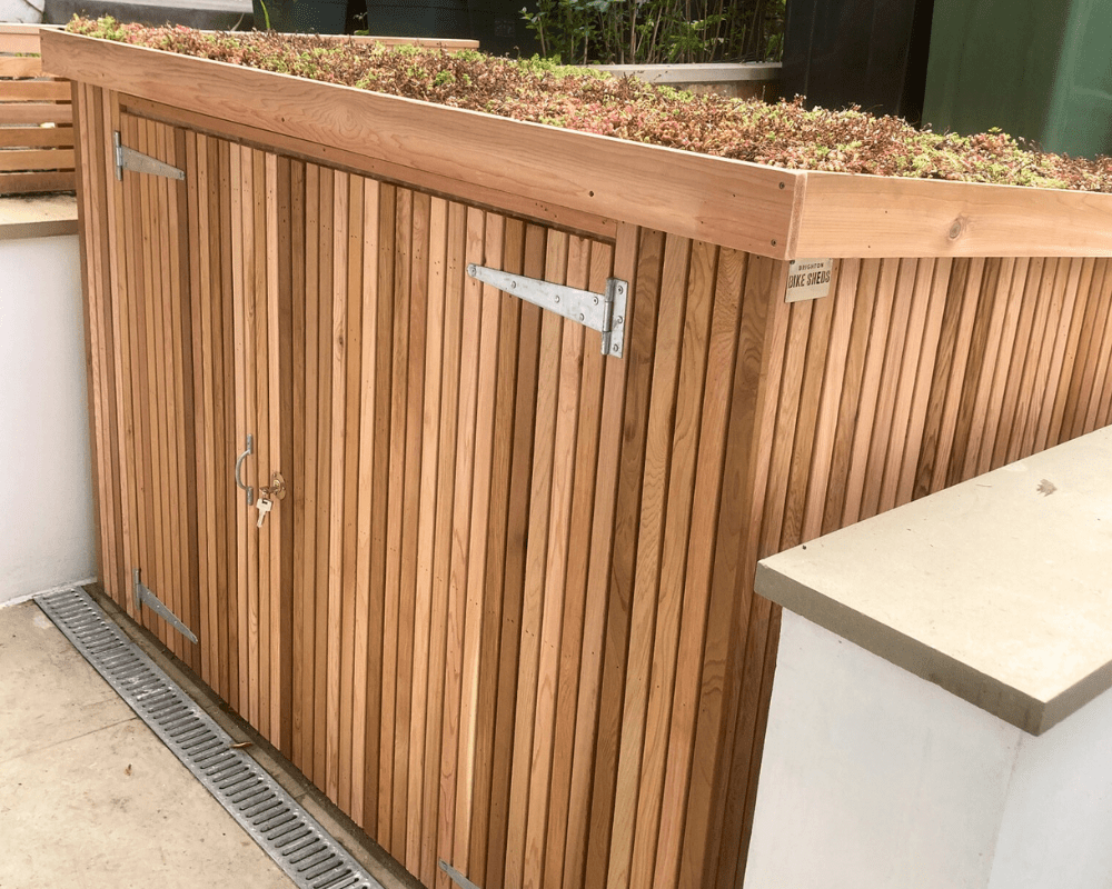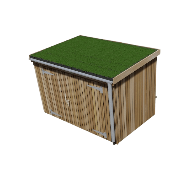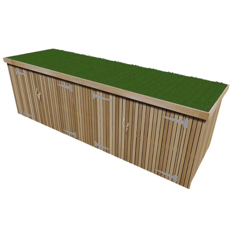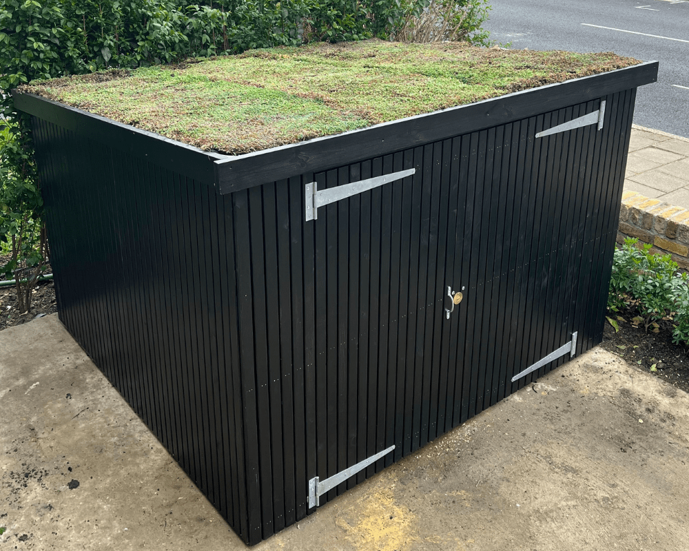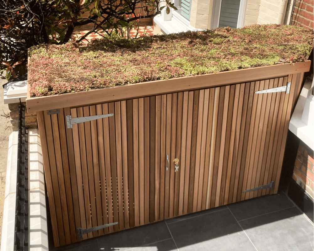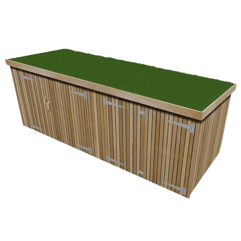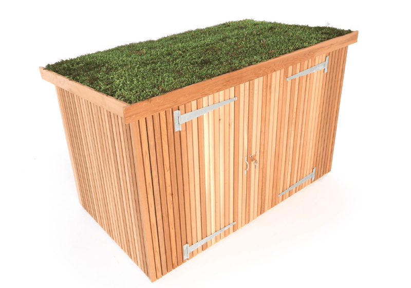 The coloured plastic bins are hidden behind naturally weathered timber cladding, which is slatted for good air flow. The green roof keeps the interior dry and the structure well protected for longevity. The green roof option can weigh over 100kg per metre squared when saturated with rain, and these units are structurally engineered to easily carry that load.