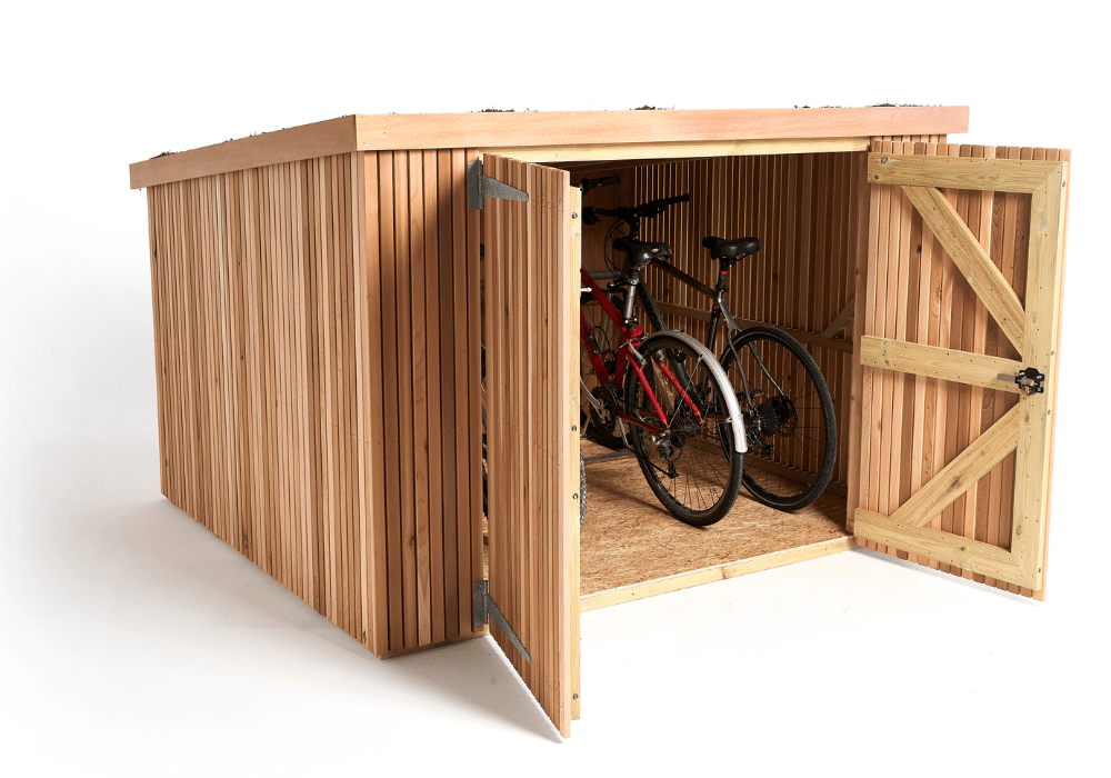 The sheds are covered with triple-layered timber cladding, shielded by a roof overhang to deter forced entry. Inside, a 32mm galvanised steel SecureBar allows for secure bike storage using locks or chains.