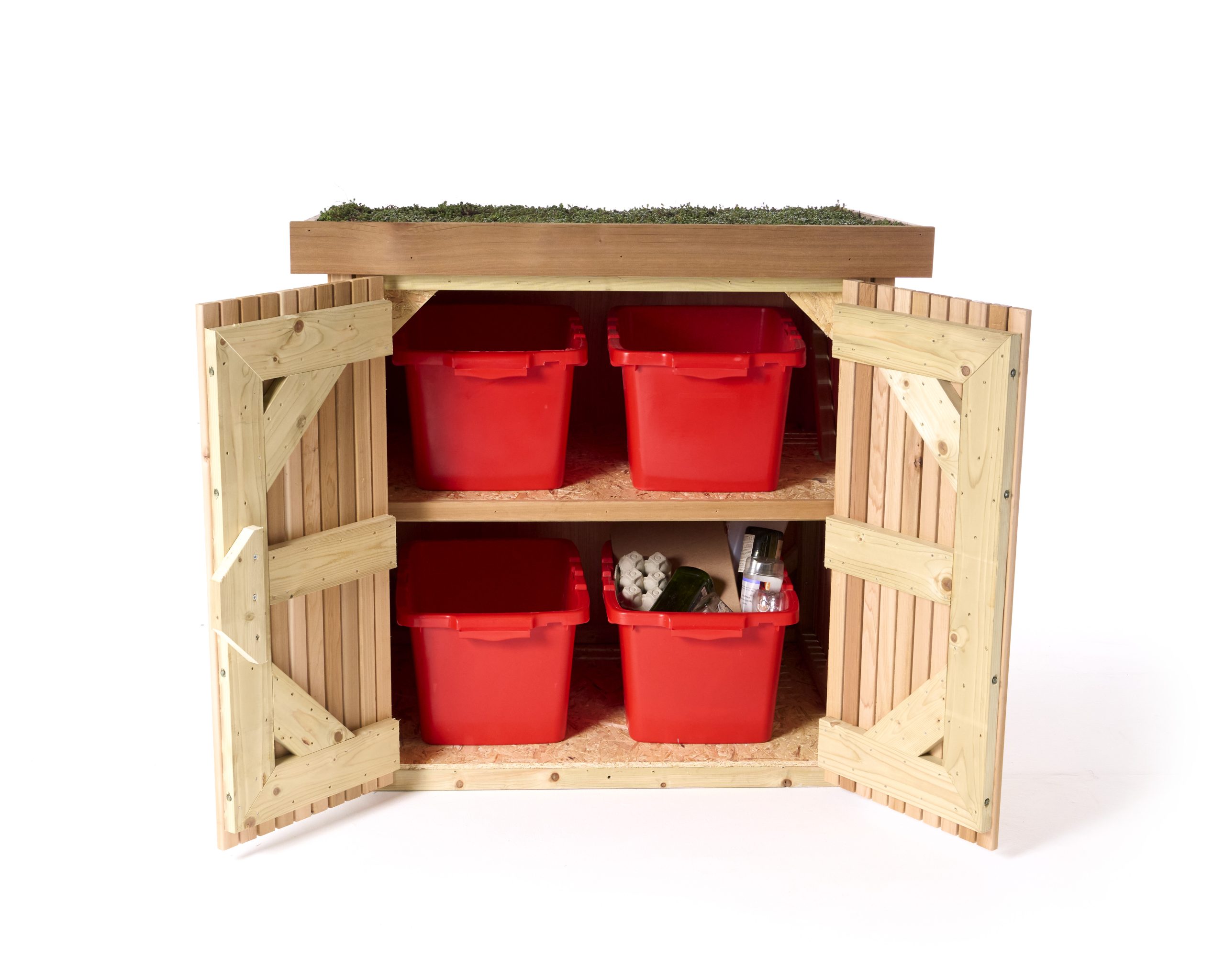 Keep your recycling boxes securely stored away in a recycling box shed built with convenient shelving.