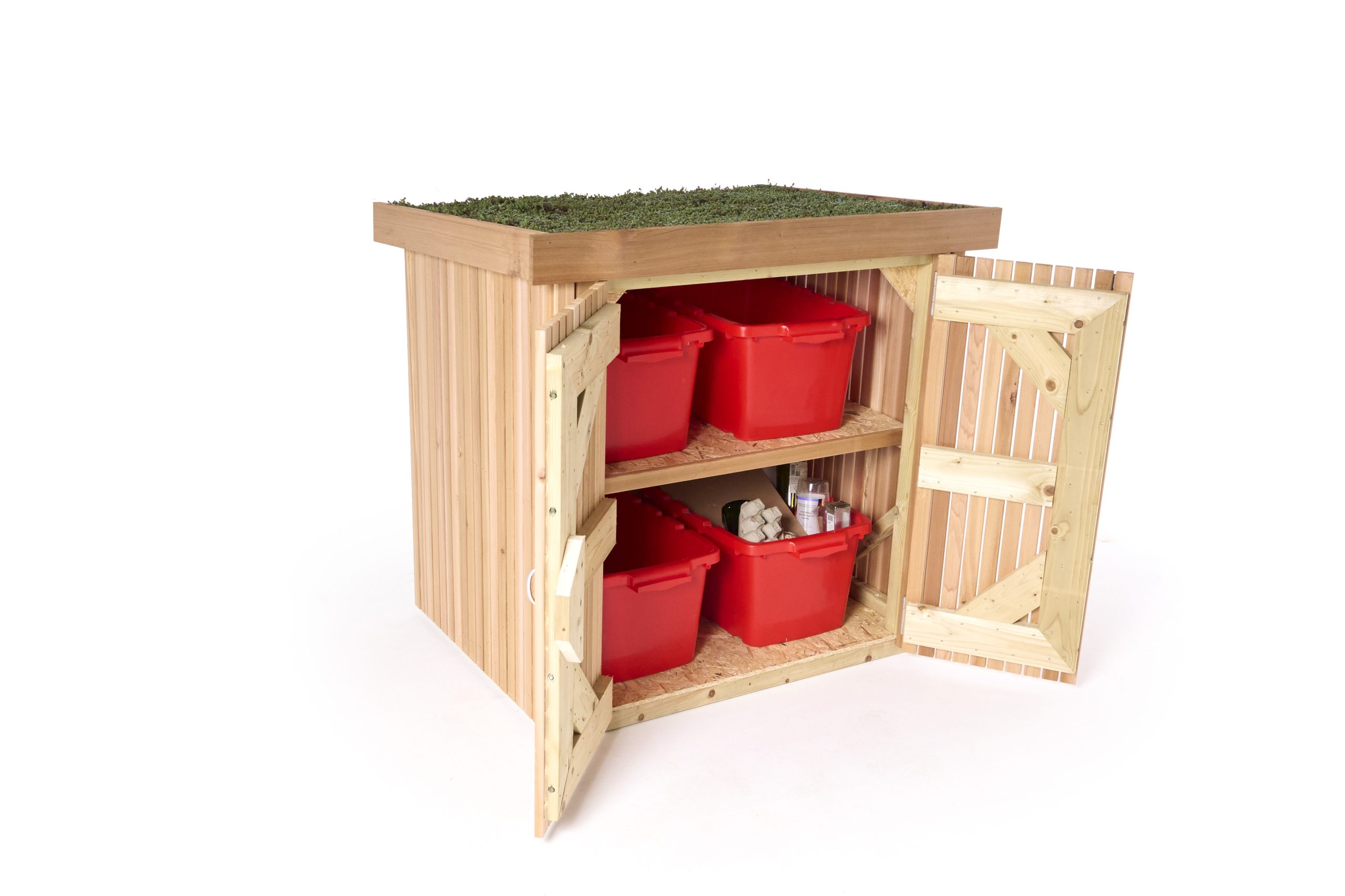 Each shed features secure doors. When closed, they keep your recycling safe from rain, snow, and wind, preventing them from getting wet or flying around.