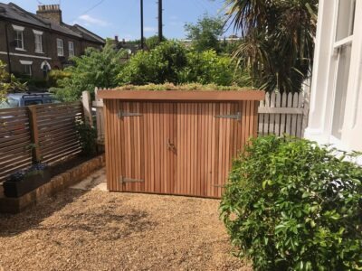 A front garden is a great place for a small bike shedâif you have enough space available. A bike storage box outside the front of your house offers convenience, as your bikes are stored right next to the street. That means no more wheeling bikes through your home every time you want to use them.